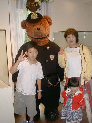 お兄ちゃん「ママだとおもったよ〜 どっちがどっちかわからな いね(笑) ママが二人だ」と、ぼろくそに言うのね。ママは、 「もっと食べると同じ大きさになるかも(爆)」と開き直って、 お兄ちゃんと写真に写ってる・・・・ このあと、売店でウインドーショッピングのつもりが、みーすけ よりも大ききなテディーベアを買ってしまう。足の裏にテディー ベア ミ二ュージアムと英語で刺繍されている。洋服を着てい るためか高かった。 買い物を終え、外に出ようとするとみーすけが居なくなった。 いたいた、喫茶店の方にちゃっかり座っている。しかたなく 家族で飲み物を頼んだ。おまけに出たクッキーが焼きたて でとてもおいしかった。 近いうちにまたテディーベアに会いにいきたいな〜 |