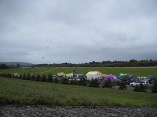 | [09/02] 大会会場の様子です。川沿いの整備された草地で緑が鮮やかです。 フィールドは申し分ないですが、小雨が降ったり止んだりと生憎の天気でした。
