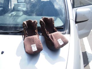 | [09/03] 乾燥中。 昨日、ずぶ濡れになった靴です。 チェックインしてすぐ新聞紙を詰めていたので比較的早く乾きました。