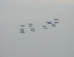 斜めに4機並んでいて先頭の機から順番にターン。帰路につきます。