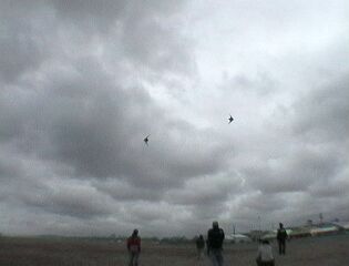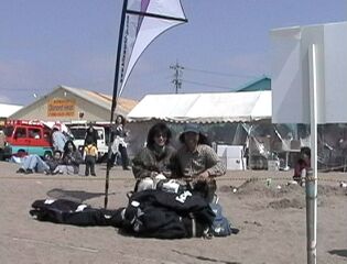 | マークリケッツ氏のデモ・フライト。 両脇にシングルライン・カイト、中央にはタープを広げたようなカイトを漂わせながら3連シナジーを操っていました。 中央のカイトは両端を二人づつで引っ張っていて上下端は一人づつ計6名で飛ばしていました。
