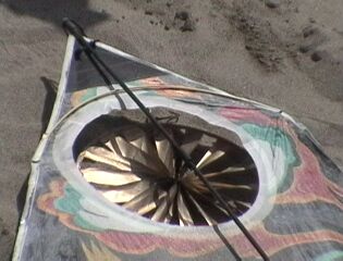 | 改造レポ。 龍がペイントしてあります。 そして、片側のタテ骨に風車が付いています。 金の玉をあらわしている模様。 ちゃんと飛んでいましたし、回っていました。