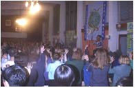 地下のサローネに戻り参加グループの紹介があり、それぞれの国のVIDESのスローガンを発表し合いました。私たちVIDES JAPANの「気負わず ムリせず できることだけ」を日本語で江崎さんが伝えると会場全体から歓声があがりました。それをSr.豊島がイタリア語に訳し、さらにロッセーラさんがフランス語と英語で同時通訳する、という具合進められていきます。スペイン語やドイツ語圏のグループには同時通訳できる人が率先して輪の中に入り小声で伝えています。ですから、拍手や歓声がウェーブのように少しずつずれるのですが、皆が耳を傾けて理解しようという気持ちは通じ合うのですね。会場全体が不思議な一体感に包まれていました。 夕食後、中庭で開催地のVIDES NAPOLIの若者たちによる歓迎の踊りが披露されました。その後サローネに移動してコンサートと劇が深夜まで続きました。本当に皆、何と元気なのでしょう。私たちは旅の疲れと時差から睡魔に襲われつつそのパワーに圧倒されて長い1日が終わりました。 |