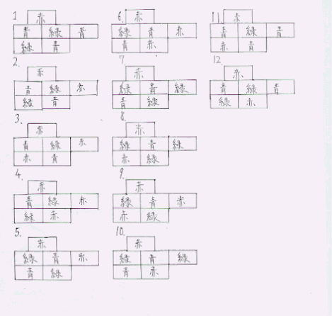 選択数学7人組です。 上を赤にしたところ■■通りありました。 そして残り2色あるので■■×■=■■通りになります。 よろしくお願いします。
