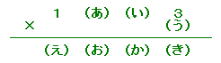 次のかけ算の(あ)〜(き)には、2、4、5、6、7、8、9 の どれかが1つずつ入ります。それを考えて答えを送って下さいね。 |