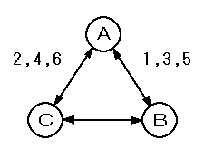 | あなたは今、【A】の位置にいて、サイコロを2回投げて、出た目の数だけ 次のルールで移動するとします。 (1) 【1】【3】【5】が出たら その目の数だけ時計回りに移動します。 (2) 【2】【4】【6】が出たら その目の数だけ時計と反対に移動します。