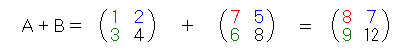 この表から分かるように、今回は1勝1敗で引き分けとなりました。 行列の「足し算」や「引き算」はこれと全く同じように、同じ場所どうしを 足し算したり、引き算したりします。