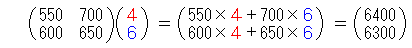 さて、この2つのお店でそれぞれ ラーメンを4杯、チャーハンを6杯 注文したとします。それぞれのお店でいくら払うか計算してみますね。 ねこ飯店 ・・ 550×4 + 700×6 = 6400(円) ぱぱ来軒 ・・ 600×4 + 650×6 = 6300(円) この計算を『行列』では、次の様に表します。