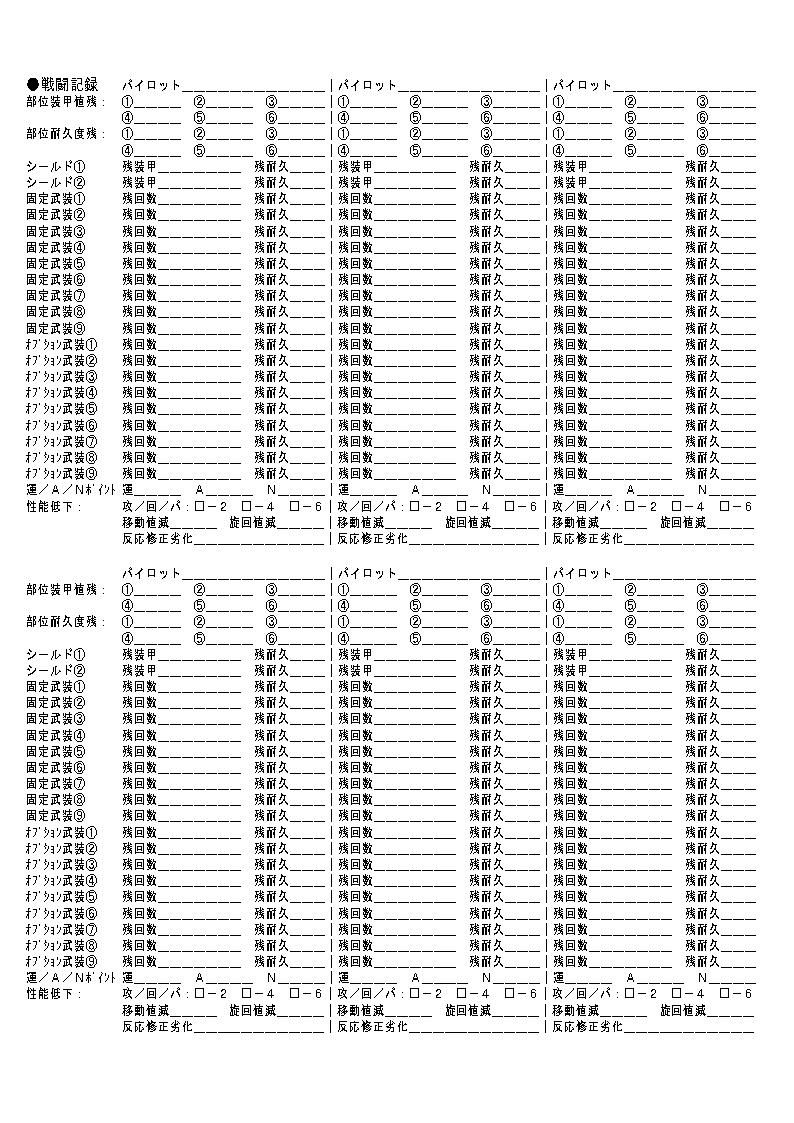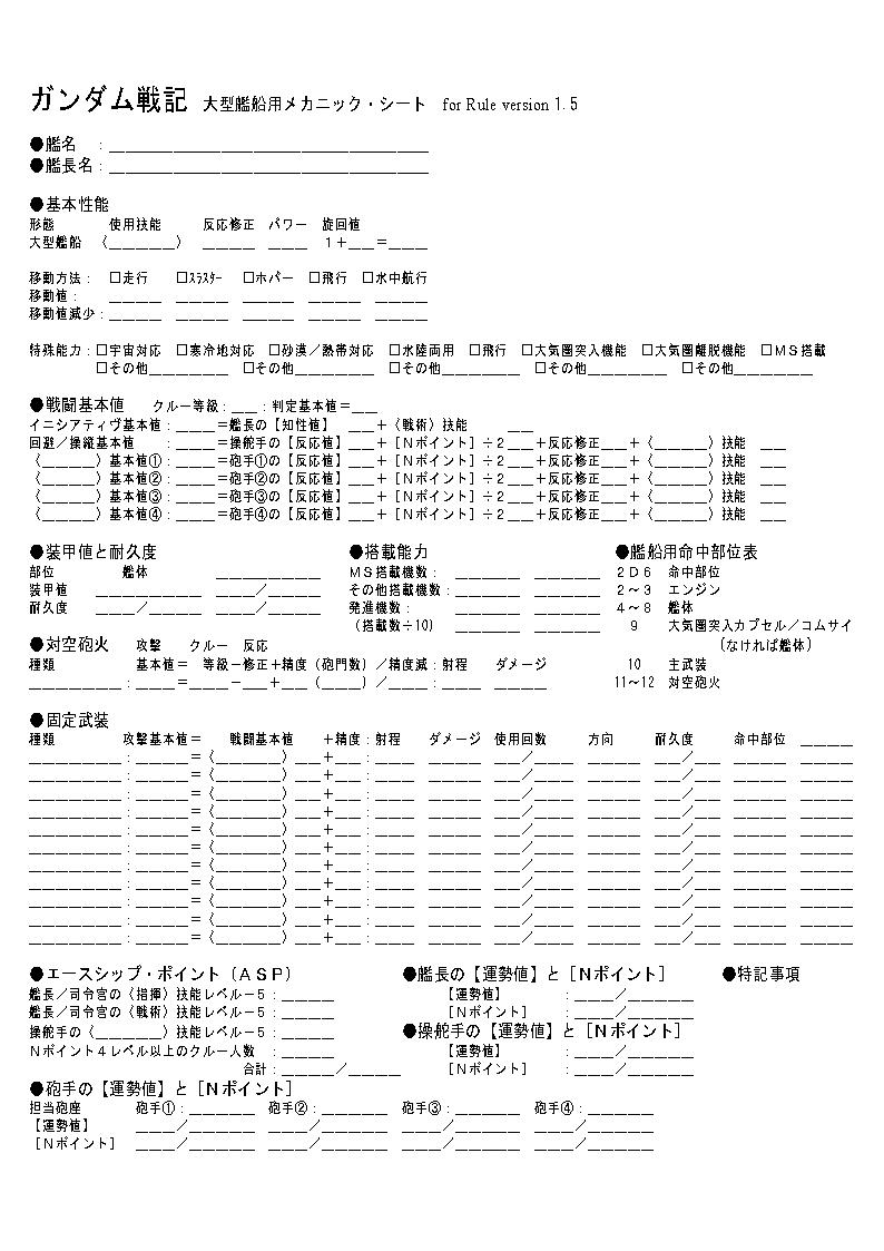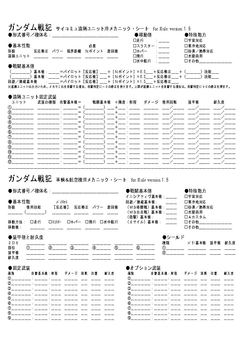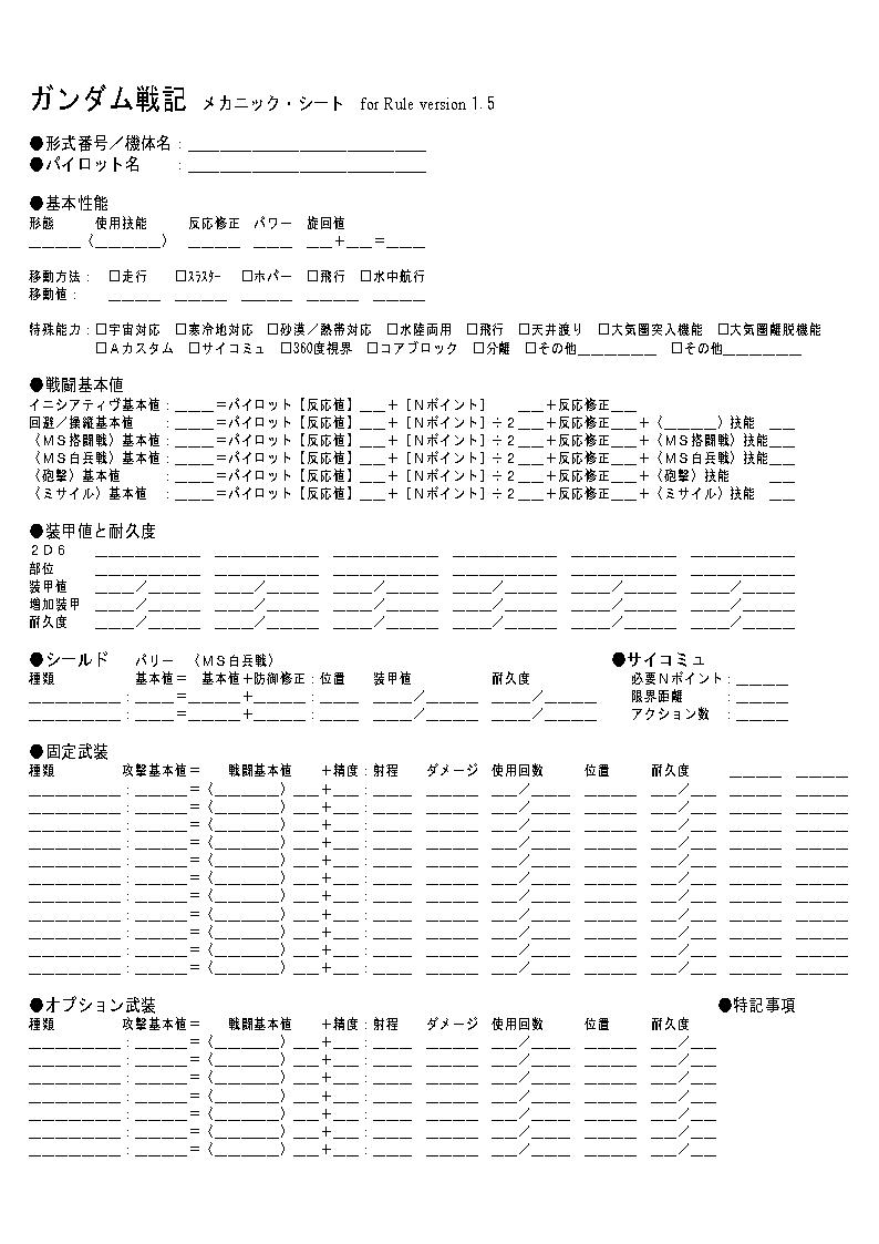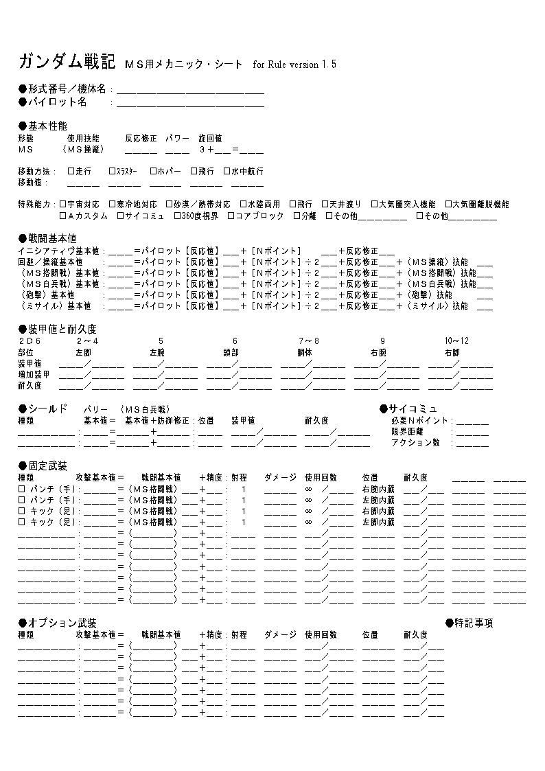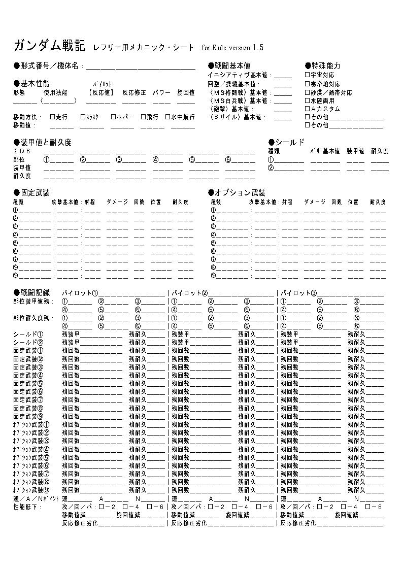 『ガンダム戦記』用各種記録シートのラフ案(アップデート・ルール対応)です。 とりあえず“お試し版”として仮公開します。御意見などありましたら、 メールか掲示板の方へお寄せ下さい。 正式なキャラシートとメカシートはTRPGサプリ5号に掲載予定です。