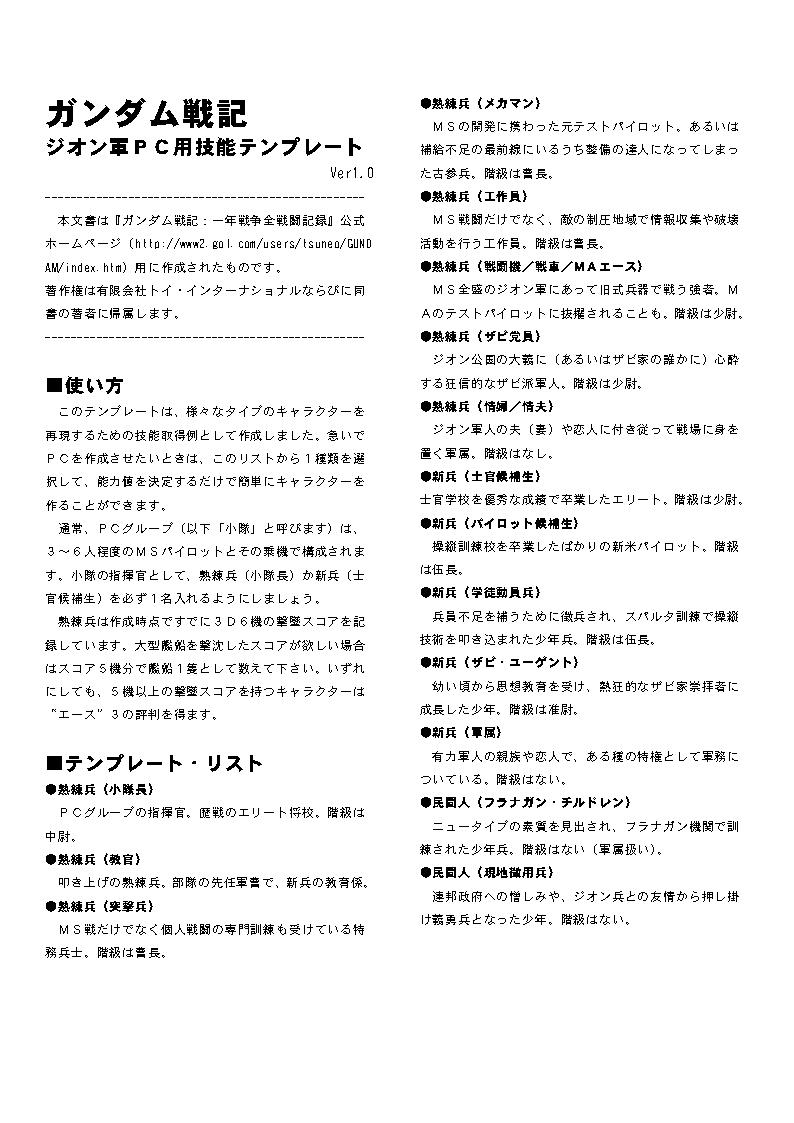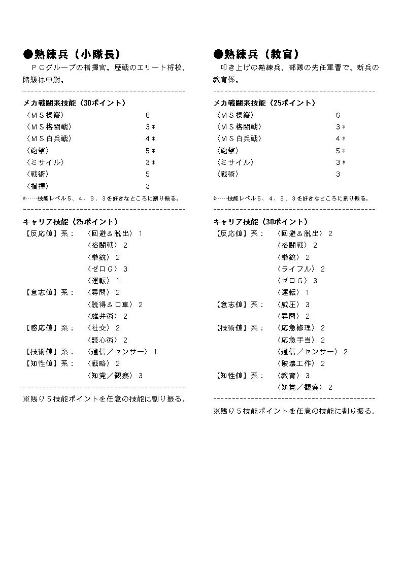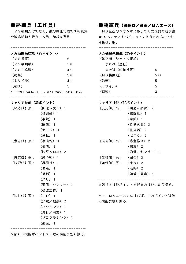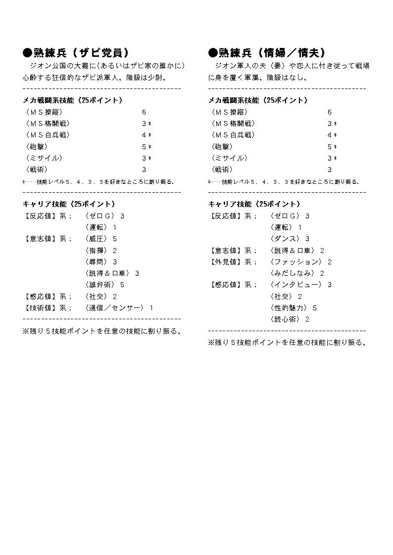 PC作成の手間を短縮するための技能テンプレートです。 ここではレイアウト済みのものを画像に変換したものを掲載してあります。 プリンクアウトして御使用下さい。 テキスト版はこちら: GS-Zeon-Template.txt