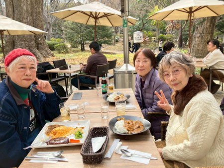 - 2/20(金)朝は曇り空だったのに、歩き始めた11;00頃は快晴。1時間余、お休みもしないで歩き通したら、背中が汗ばむほどの陽気となった。最初の「昭和館」は児童・生徒がいっぱい、学校の社会科教育の一環か? 熱心にメモをとる姿には心を打たれた。女子中学生と防空壕に一緒に入る体験もした。その後、北の丸公園を抜けて、皇居東御苑を目指したがなんと定休日だった。それにもめげず、日比谷公園まで歩いて、お目当ての<松本楼のカレー>を食して大満足!!参加は笠原さん、濱島さん、張替さん、杉山さん、橋本さん、私の6人。